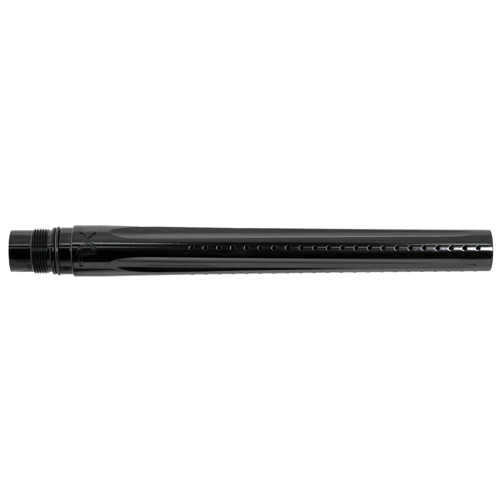 The linear porting arrangement and oval porting in the tip dissipates turbulent air quickly and efficiently to prevent paintball deformation and turbulence to insure shot after shot accuracy.