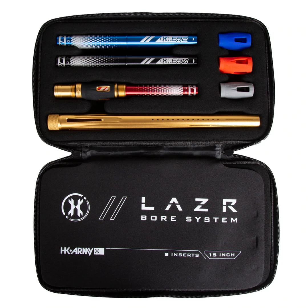 The LAZR Barrel Kit comes complete with 8 Barrel Bore Inserts, a Barrel Tip and 4 Interchangeable Accent Grips. The LAZR barrel is packaged in our custom HK Army Hard Shell Exo Barrel Case.