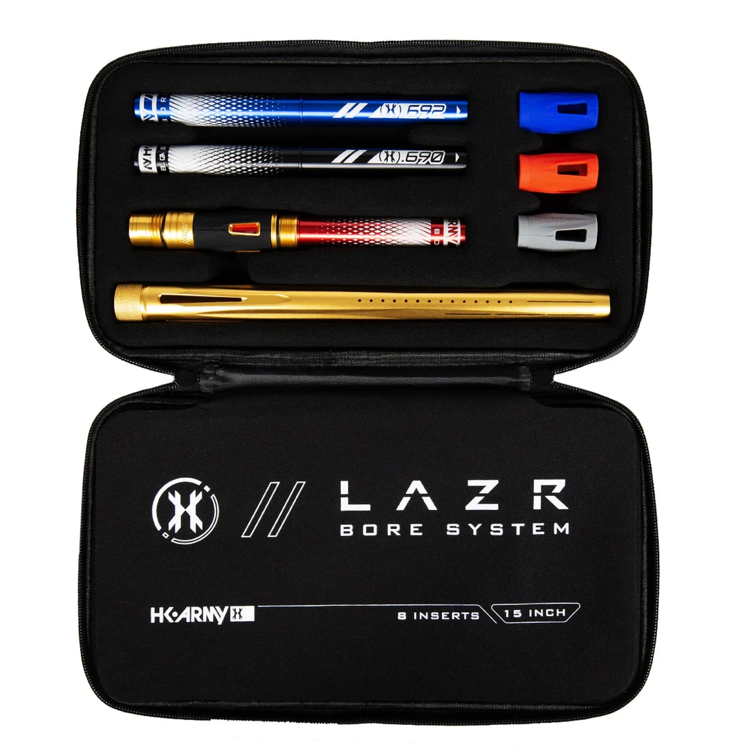 The LAZR Barrel Kit comes complete with 8 Barrel Bore Inserts, a Barrel Tip and 4 Interchangeable Accent Grips. The LAZR barrel is packaged in our custom HK Army Hard Shell Exo Barrel Case.