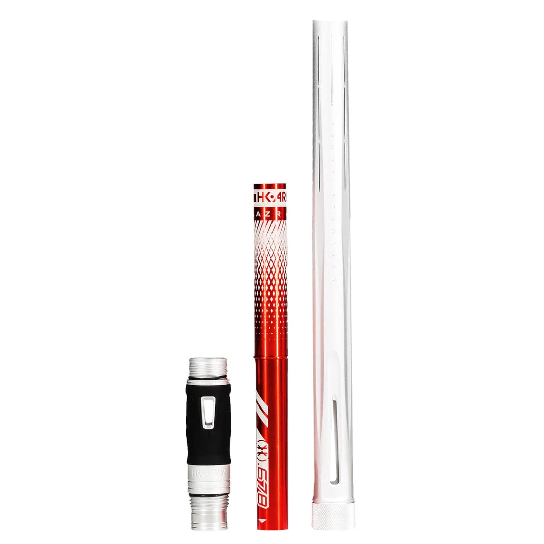 The LAZR Barrel Kit comes complete with 8 Barrel Bore Inserts, a Barrel Tip and 4 Interchangeable Accent Grips. The LAZR barrel is packaged in our custom HK Army Hard Shell Exo Barrel Case.