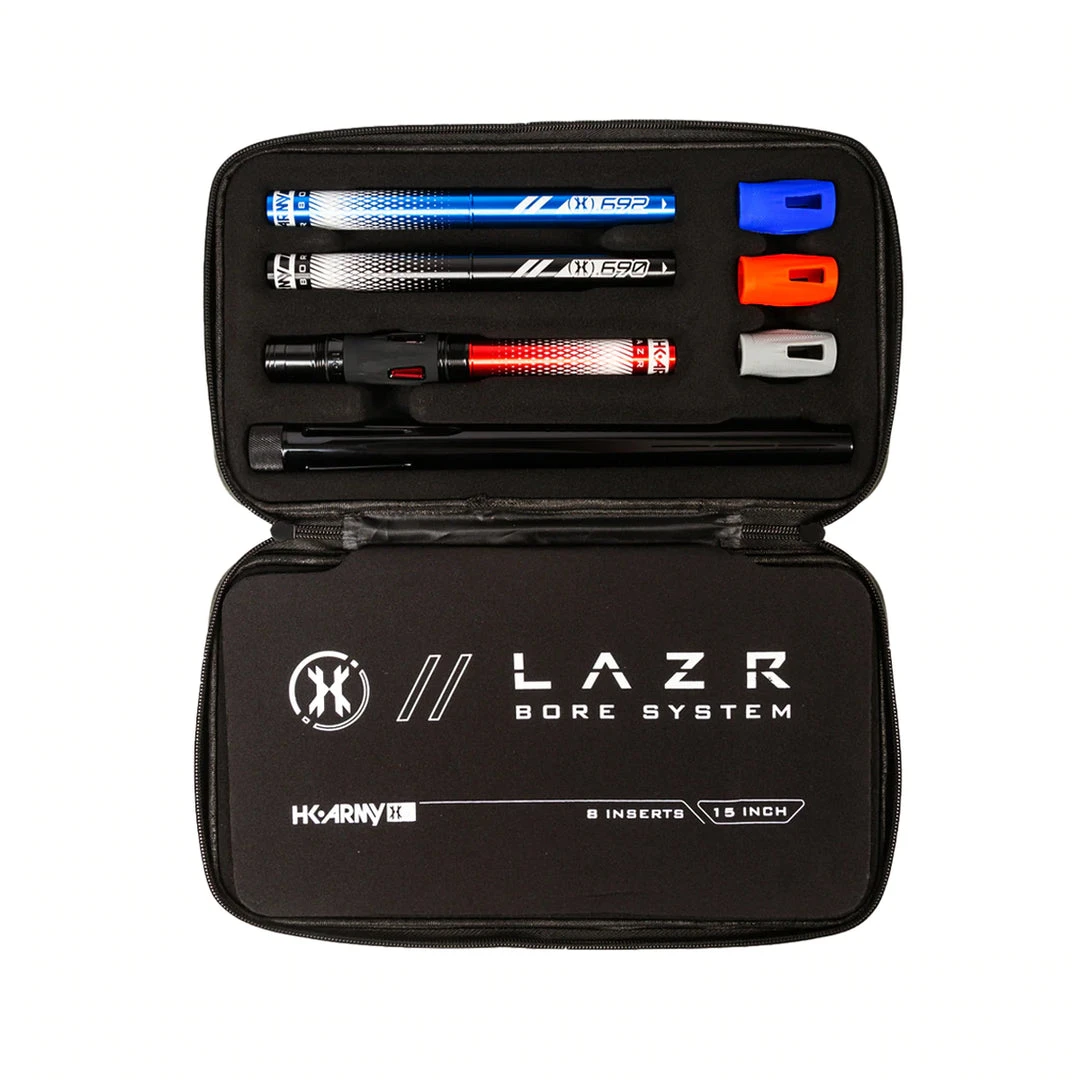 The LAZR Barrel Kit comes complete with 8 Barrel Bore Inserts, a Barrel Tip and 4 Interchangeable Accent Grips. The LAZR barrel is packaged in our custom HK Army Hard Shell Exo Barrel Case.