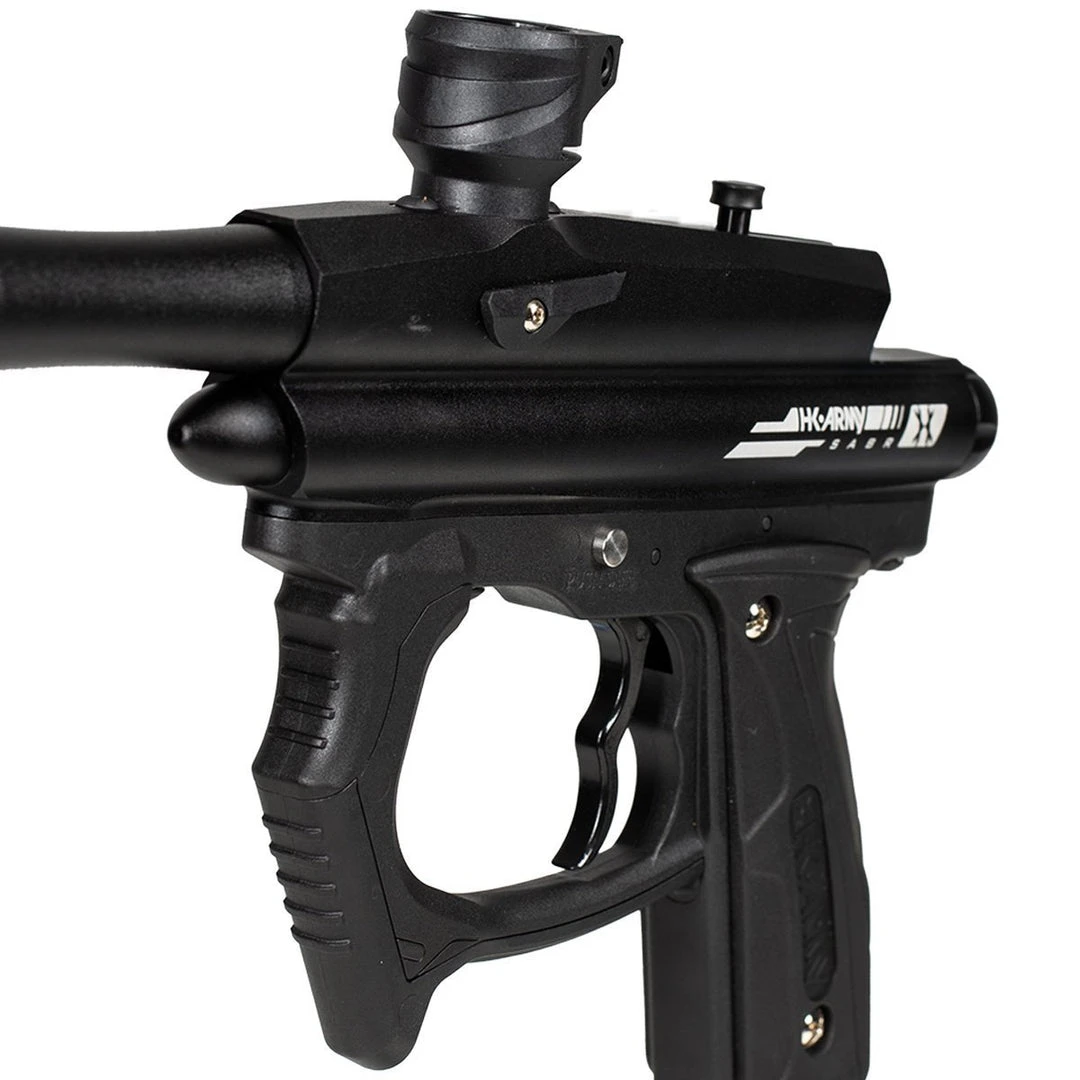 The HK Army Sabr paintball gun has arrived and is ready to help you slice up the competition! Impressive features and a simple, time-tested mechanical blowback operating system combine at an amazing price that’s within reach of any paintball player with the HK Army Sabr! A semi-automatic paintball gun with a double trigger for faster firing, the HK Sabr paintball gun offers extremely useful features like a clamping, vertical feed neck to secure practically any hopper, a hose-free design that eliminates external air hoses that might fail, and an Autococker-threaded, twelve inch ported barrel for accuracy and consistency! Simple to maintain thanks to its quick-pull Delrin, self-lubricating bolt, easy-access ball detents and simple, clearly marked velocity adjustment, the HK Army Sabr is able to operate on CO2 or compressed air, and offers impressive looks and performance for an unbeatable price!