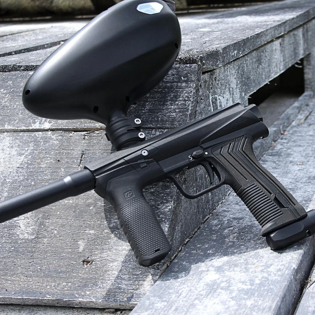 Simple yet packed with features, lightweight yet tough and rugged, the Eclipse EMek paintball gun puts simple, mechanical reliability in a reliable package any player can afford! Built around the Gamma Core drive train that is simple to remove, clean and maintain while remaining easy on paintballs and consistent in any weather, the Eclipse EMek paintball gun keeps the weight low with a glass-reinforced nylon outer shell, and is delivered with an impressive list of standard features for a paintball gun in its price range, including hose-free air transfer, an aluminum, Autococker-threaded barrel, a clamping feed neck to prevent a player’s hopper from spinning or falling off mid-game, a comfortable, knurled vertical foregrip and a short, crisp trigger pull for impressive mechanical rates of fire! Able to punch well above its weight, at its price there is simply no better paintball gun than the Eclipse EMek!
