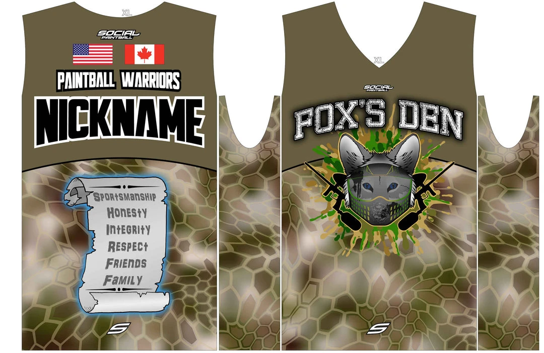 You can now order your own official Fox’s Den paintball team jerseys and other custom apparel. This will be made on our sleeveless paintball jersey cut. The sleeveless jersey features mesh ventilation and is ideal for both playing paintball on the field or wearing casually around town.
