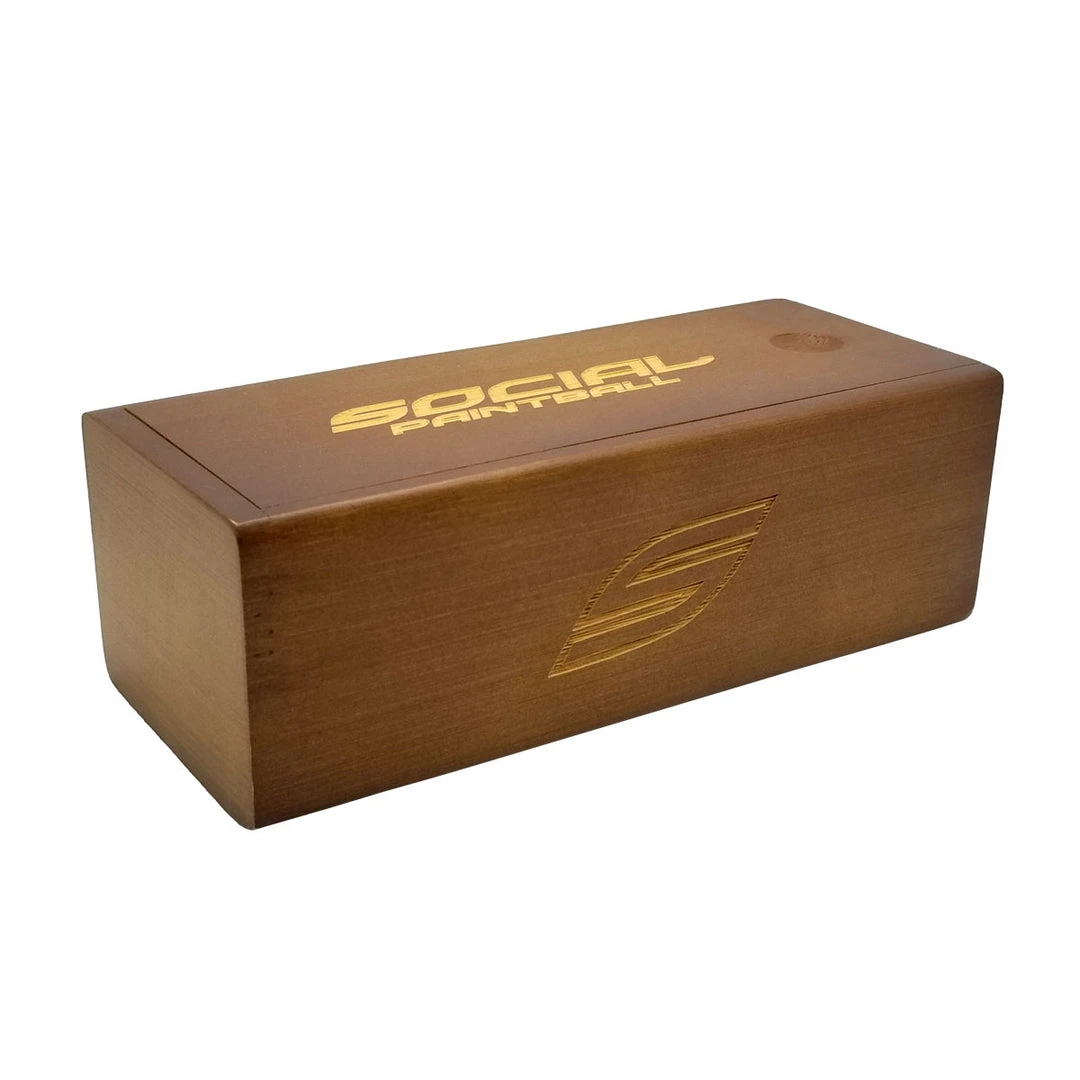 Block out the sun while at a paintball tournament with our polarized Social Paintball dual tone skateboard wood sunglasses. Made with 100% recycled skateboard wood, each pair is cut from used skateboards. The lightweight skateboard wood offers a comfortable fit that is durable and sturdy at the same time. The red mirror lenses are polarized, offering 100% UVA/UVB protection even in intense lighting conditions. These glasses are stylish, durable, and natural. Each pair includes a durable carrying case emblazoned with the Social Paintball logo. Carrying case measures 2 inches by 3 inches by 6.5 inches.
