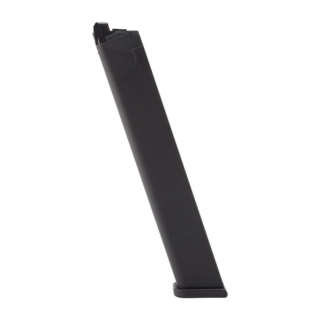 The Umarex GLOCK G18 Green Gas 50rd extended spare airsoft magazine by VFC is made from heavyweight aluminum, giving a hefty feel to the G18 airsoft pistol. The extended GLOCK magazine offers over twice the shots as regular GBB magazines. This green gas Umarex magazine has a high-efficiency internal gas system providing excellent FPS output, and reinforced valves and seals for optimal gas retention. We recommend using Valken Green Gas with this gas pistol magazine.