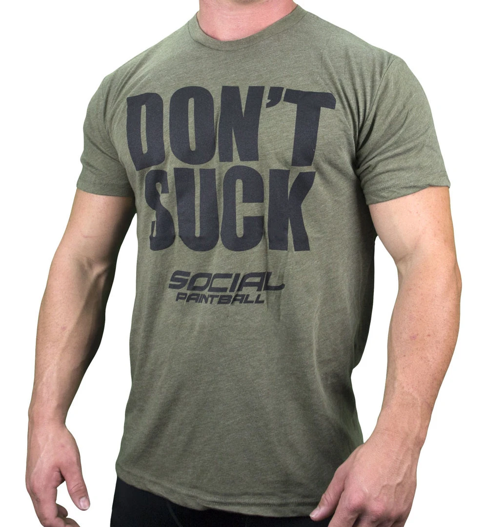 Social Paintball’s “Don’t Suck” slogan printed on front of olive green shirt. Athletically cut shirt, signature blended style, super-soft crew, preshrunk 50% polyester/25% cotton/25% rayon jersey, 4.3-oz., 32 singles for extreme softness, 1×1 rib-knit set-in collar, satin label. Don’t Suck graphic on front of olive green shirt. Made in the USA.