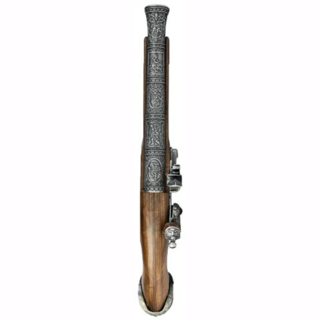 The HFC 18th Century Flintlock Airsoft Pistol is a green gas powered replica pirate pistol. This Blunderbuss pistol is an authentic 1:1 scale replica with highly detailed filigree, which enhances the pistols appearance and authenticity. The high quality metal alloy construction and imitation wood makes this gun truly unique. This great replica prop for pirates and musketeers alike has realistic functionality. So it operates just like a real flint lock pistol. Green gas is loaded into the grip, and 21 airsoft BBs are loaded into an internal magazine under the barrel. This airsoft gun comes with a faux leather powder flask for storing BBs, and the instruction manual comes in the appearance of an old parchment scroll. We recommend using our Valken Green Gas with this airsoft pistol.