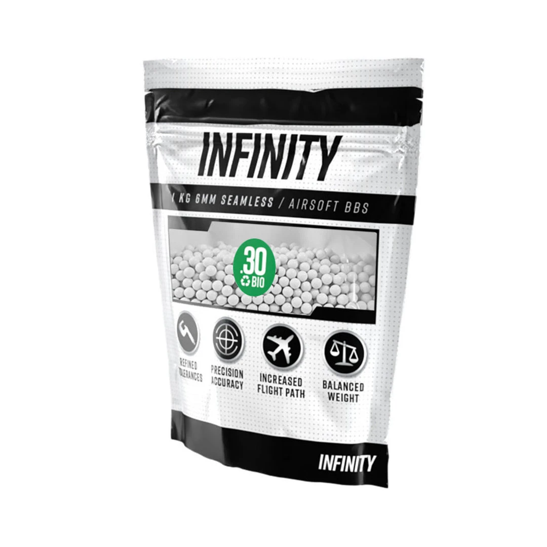 The Infinity 0.28g airsoft BBs are precision 6mm plastic BBs from Taiwan that are highly polished and seamless BBs for 6mm airsoft rifles and airsoft pistols. Their ball bearing quality precision gives the flight path greater accuracy and consistency. The Infinity airsoft BBs are packaged in a 1 kilogram resealable bags. We recommend our Valken M4 Magazine Style BB Speed Loader for use with Infinity BBs when loading mid-cap magazines.